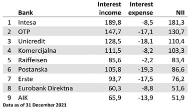 Only the top 9 banks by assets on 31 December 2021 realized net interest income above EUR 50.