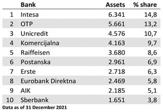 Total assets on a sector level on 31 December 2021 were EUR 42.9bn. The concentration is increasing. The top 10 banks have assets of EUR 36.4bn, which is 84.8% of the total assets. The top 5 banks have assets of EUR 24.4bn, which is 56.9% of the total assets in the Serbian banking sector.